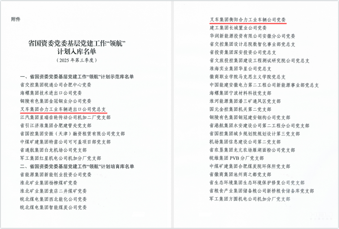 安徽叉車集團(tuán)黨委兩個(gè)黨組織分別入選省國(guó)資委黨委基層黨建工作“領(lǐng)航”計(jì)劃示范庫、培育庫